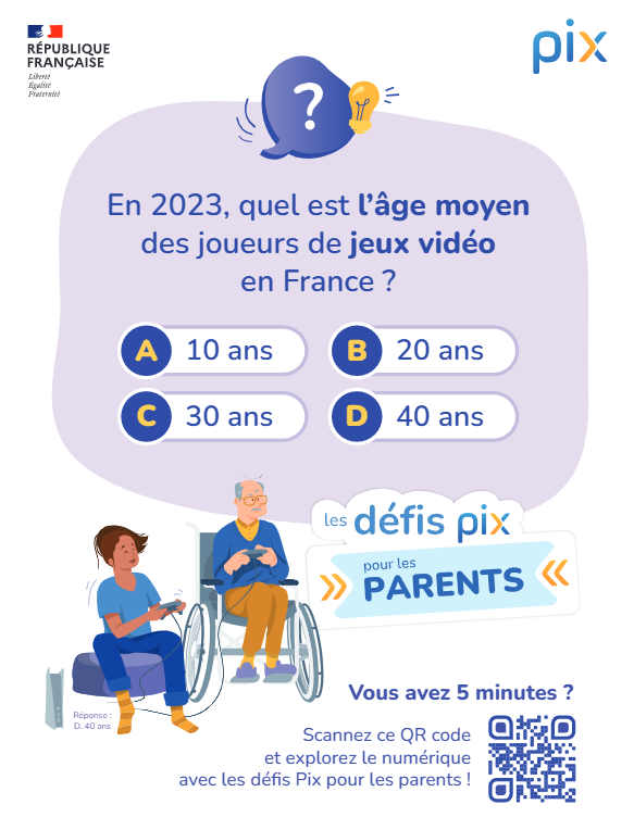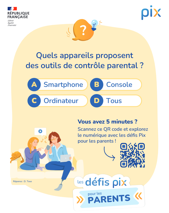 Pour accompagner tous les parents dans l’acquisition de ces compétences indispensables, la plateforme Pix propose des défis dédiés à la parentalité numérique leur permettant de jouer un rôle actif et éclairé auprès de leurs enfants avec :